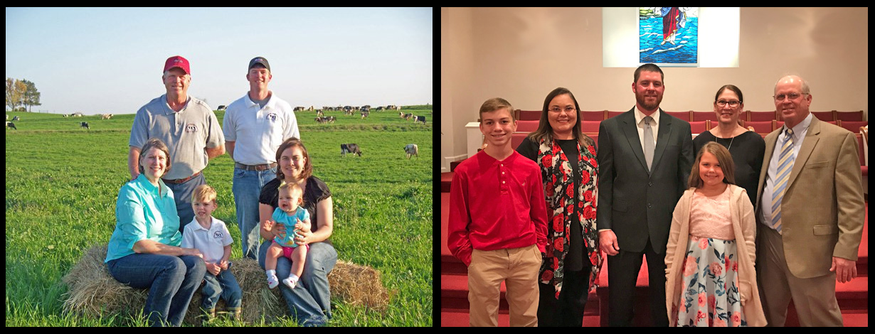 | My parents, wife, children, and I on the farm in 2010 and at my deacon ordination service in 2019. |